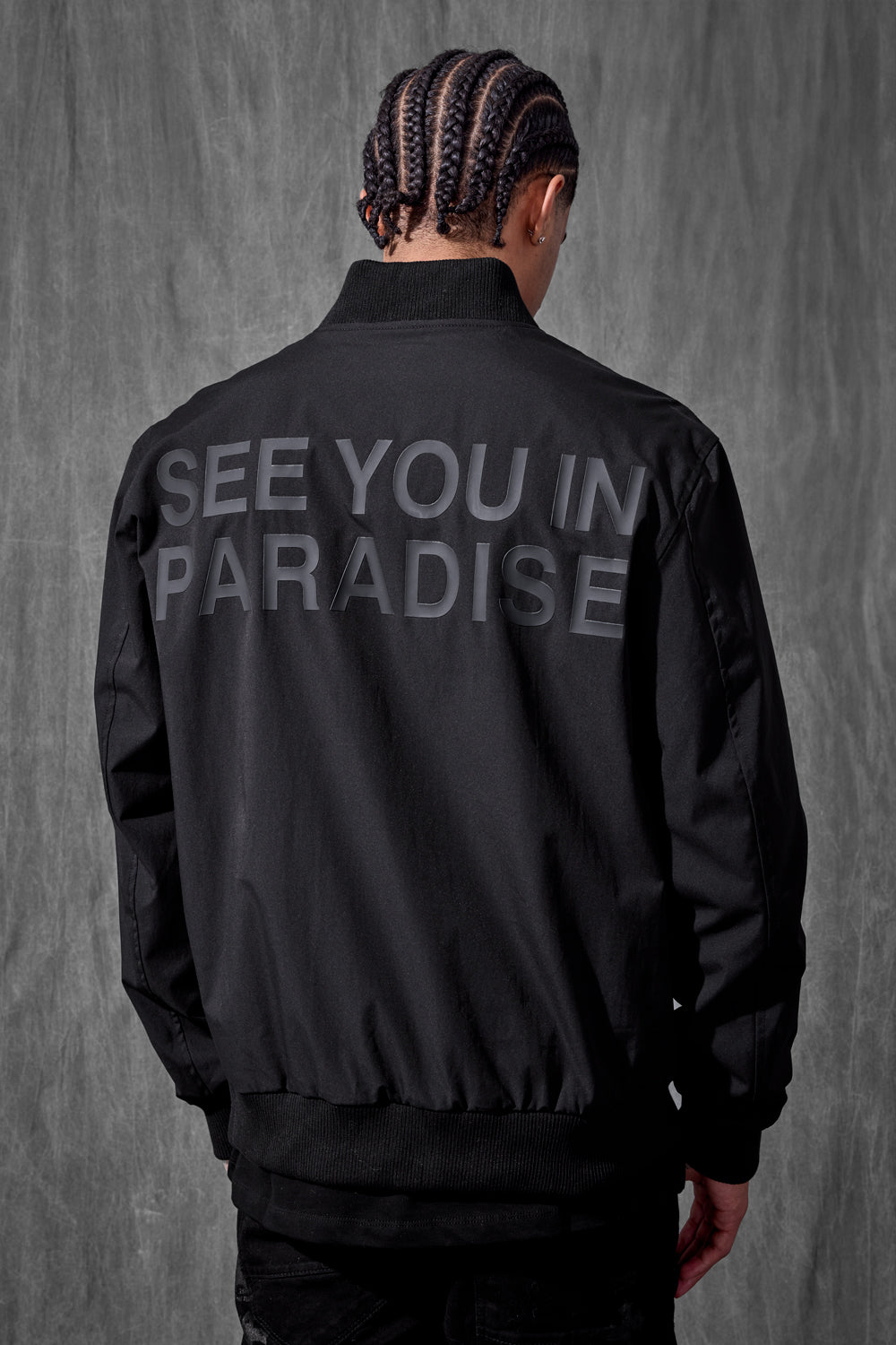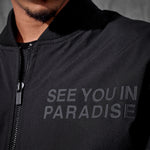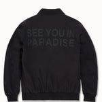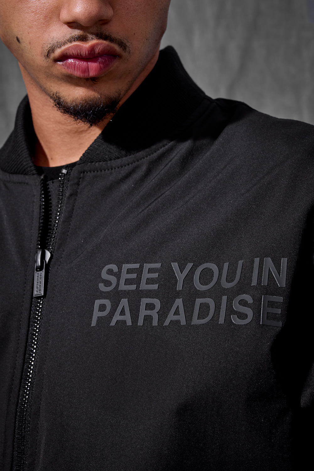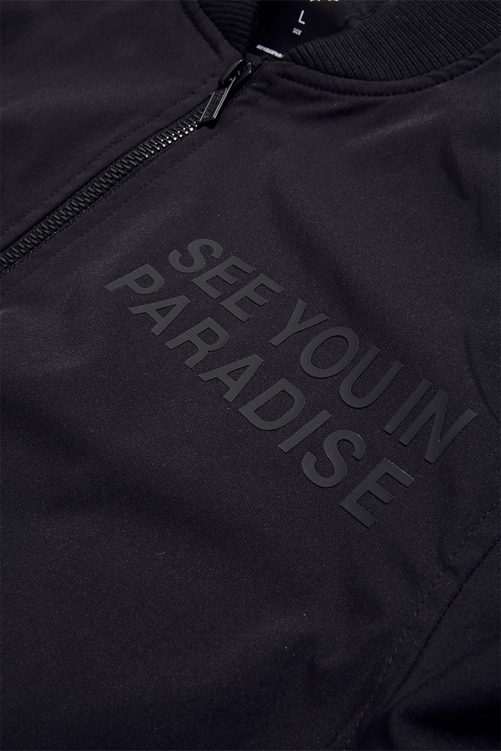 Cut in a lightweight bomber silhouette with sleek tailoring, this jacket delivers that See You In Paradise attitude without saying a word. The high-density tonal print on both the chest and back provides an elevated touch of bandage-worthy branding—visible only when worn right. Constructed in breathable fabric, it layers effortlessly and plays well with the transition from daylight to nightlife. Offered in four season-defining colors—Black, Light Grey, Moon Rock, and Light Pink—this bomber is your go-to mood shifter. Whether you're pairing it with minimalist denim or building a full-on set, it’s made to hit where you show up: clean, confident, and compact. This piece sets the tone—and the temperature—for what Paradise means now