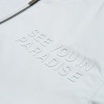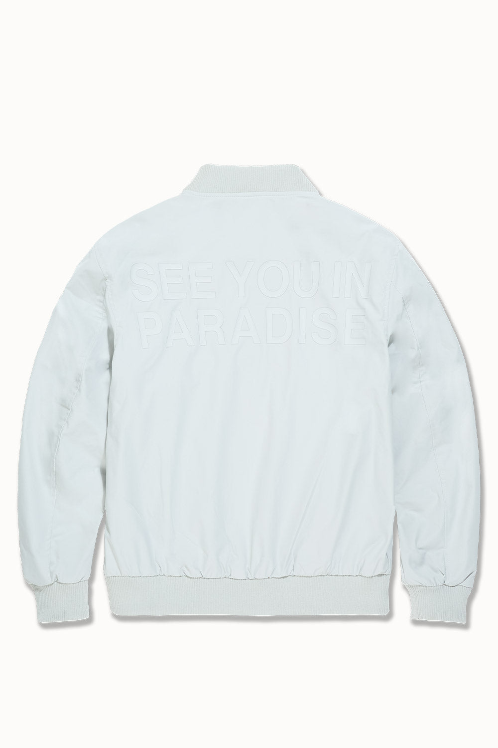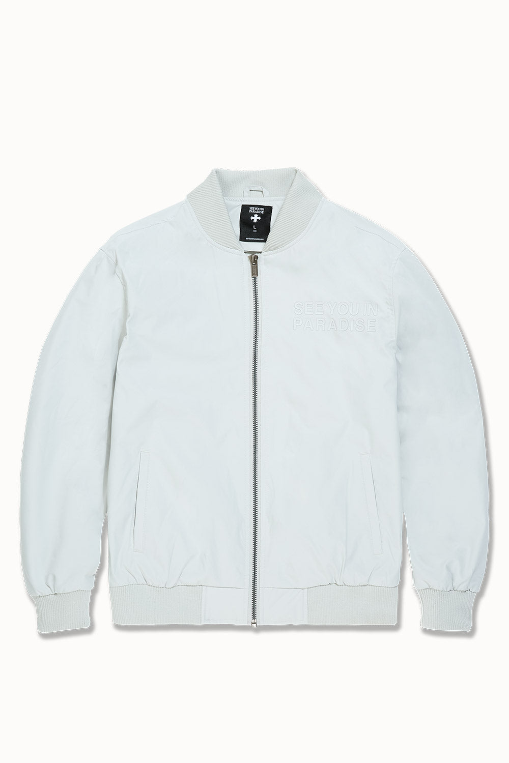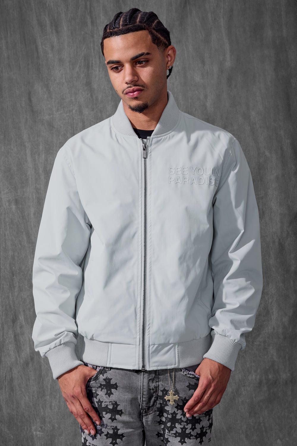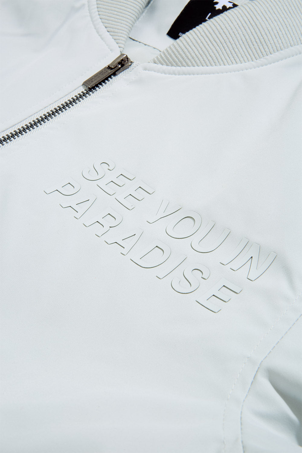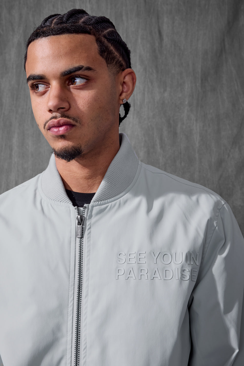 Cut in a lightweight bomber silhouette with sleek tailoring, this jacket delivers that See You In Paradise attitude without saying a word. The high-density tonal print on both the chest and back provides an elevated touch of bandage-worthy branding—visible only when worn right. Constructed in breathable fabric, it layers effortlessly and plays well with the transition from daylight to nightlife. Offered in four season-defining colors—Black, Light Grey, Moon Rock, and Light Pink—this bomber is your go-to mood shifter. Whether you're pairing it with minimalist denim or building a full-on set, it’s made to hit where you show up: clean, confident, and compact. This piece sets the tone—and the temperature—for what Paradise means now