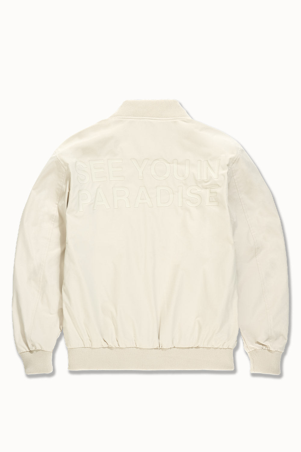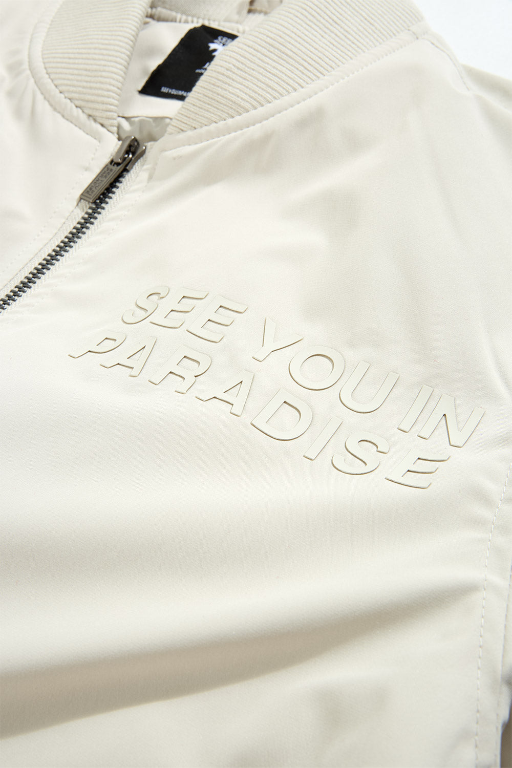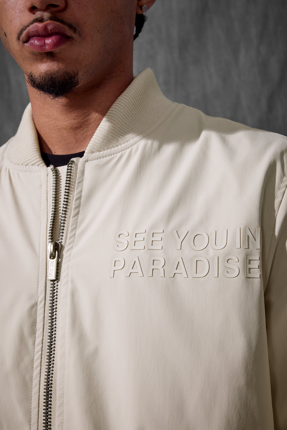 Cut in a lightweight bomber silhouette with sleek tailoring, this jacket delivers that See You In Paradise attitude without saying a word. The high-density tonal print on both the chest and back provides an elevated touch of bandage-worthy branding—visible only when worn right. Constructed in breathable fabric, it layers effortlessly and plays well with the transition from daylight to nightlife. Offered in four season-defining colors—Black, Light Grey, Moon Rock, and Light Pink—this bomber is your go-to mood shifter. Whether you're pairing it with minimalist denim or building a full-on set, it’s made to hit where you show up: clean, confident, and compact. This piece sets the tone—and the temperature—for what Paradise means now