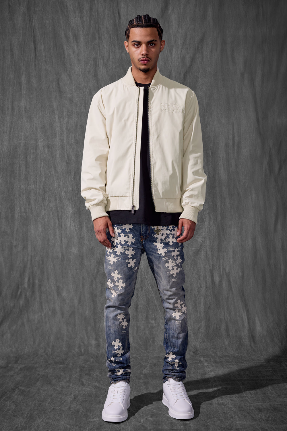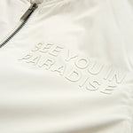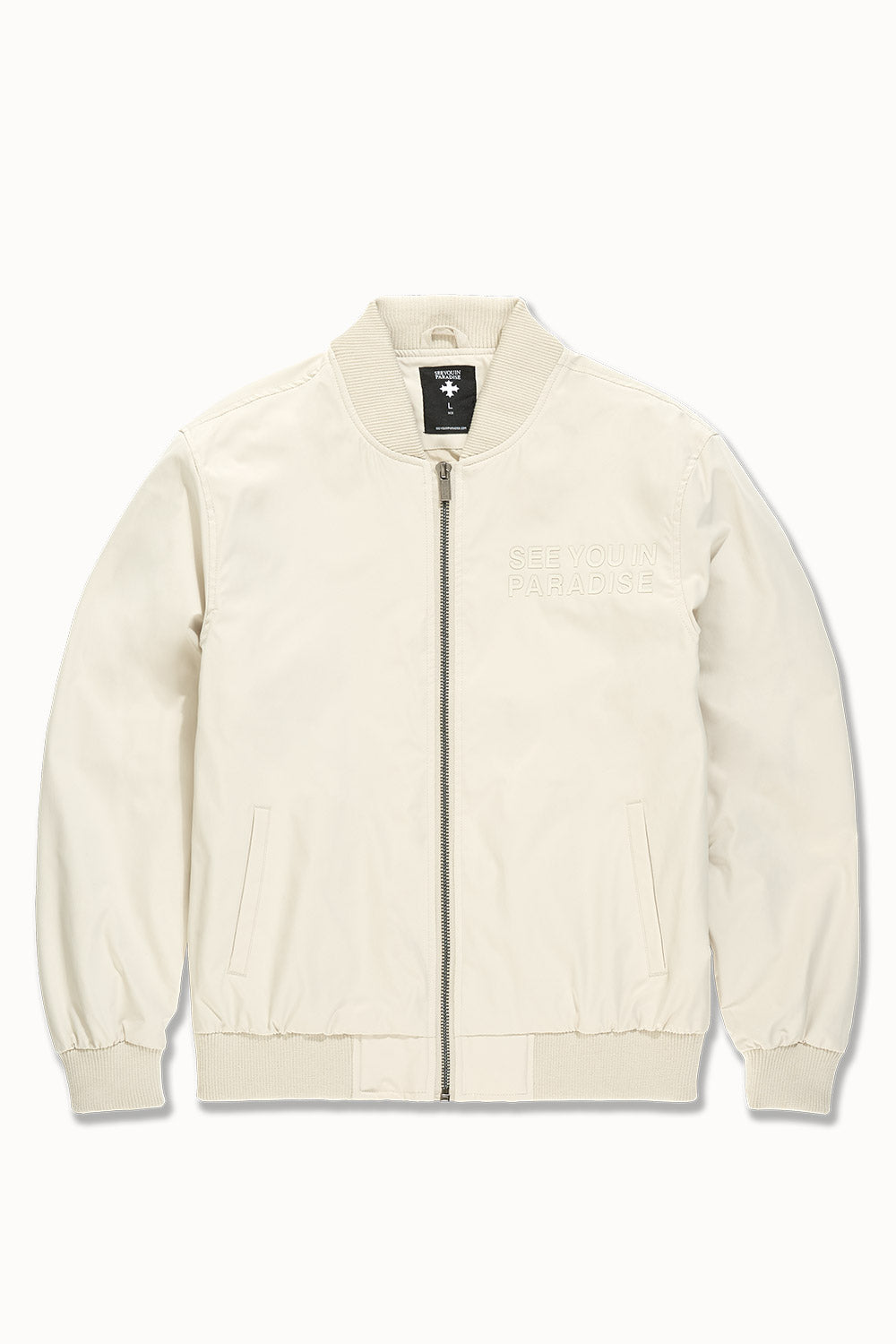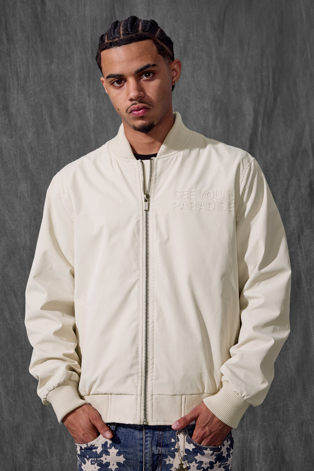 Cut in a lightweight bomber silhouette with sleek tailoring, this jacket delivers that See You In Paradise attitude without saying a word. The high-density tonal print on both the chest and back provides an elevated touch of bandage-worthy branding—visible only when worn right. Constructed in breathable fabric, it layers effortlessly and plays well with the transition from daylight to nightlife. Offered in four season-defining colors—Black, Light Grey, Moon Rock, and Light Pink—this bomber is your go-to mood shifter. Whether you're pairing it with minimalist denim or building a full-on set, it’s made to hit where you show up: clean, confident, and compact. This piece sets the tone—and the temperature—for what Paradise means now
