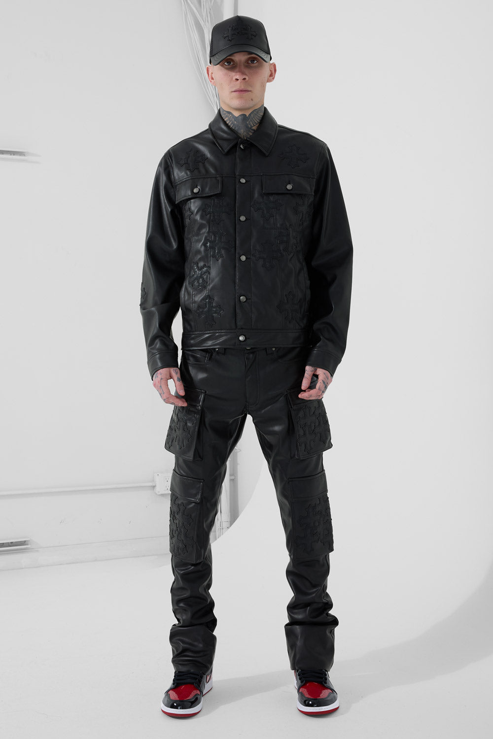 - Tonal vegan leather patches throughout