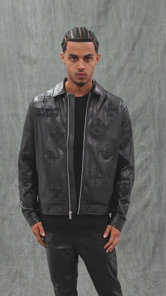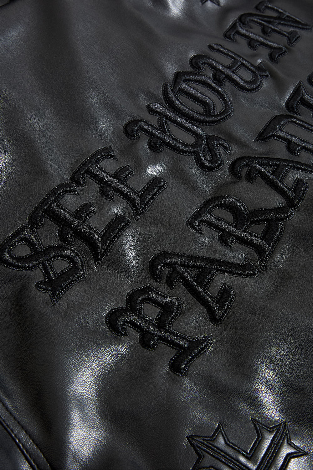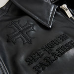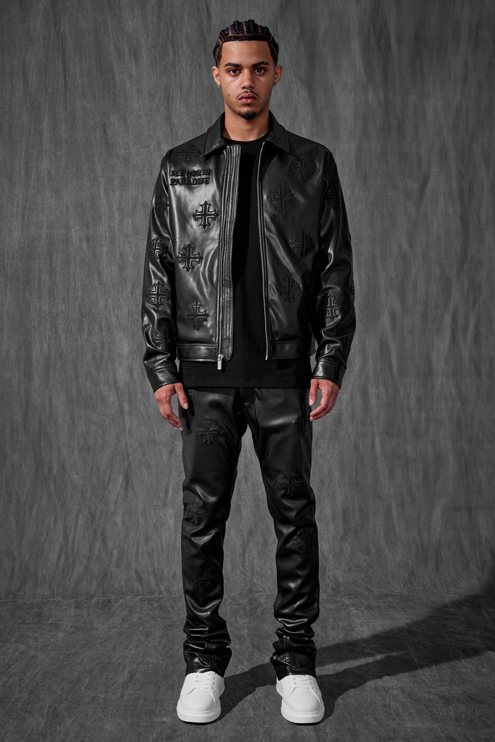 Designed to be the highlight of our debut drop, the Inferno Trucker Jacket brings premium edge to the classic trucker silhouette. Crafted in ultra-soft vegan leather with tonal embroidery throughout, it’s built to catch eyes without going over the top. The full-zip front and tailored fit keep it clean and structured, while the subtle See You In Paradise hits make it clear where you stand. Pair it with the matching Skinny Stacked Inferno Pants for the full look that defines the collection. This isn’t just another jacket—it’s the piece you build the night around.