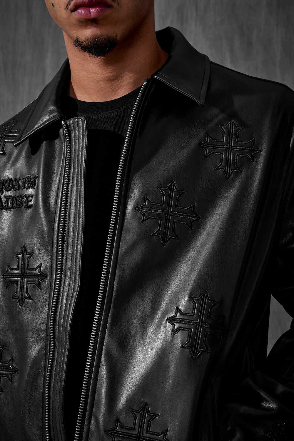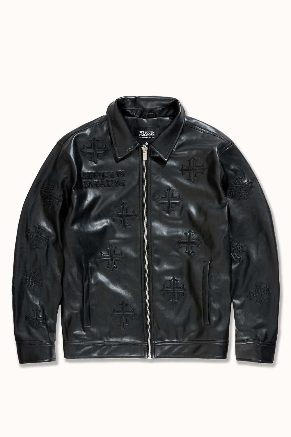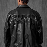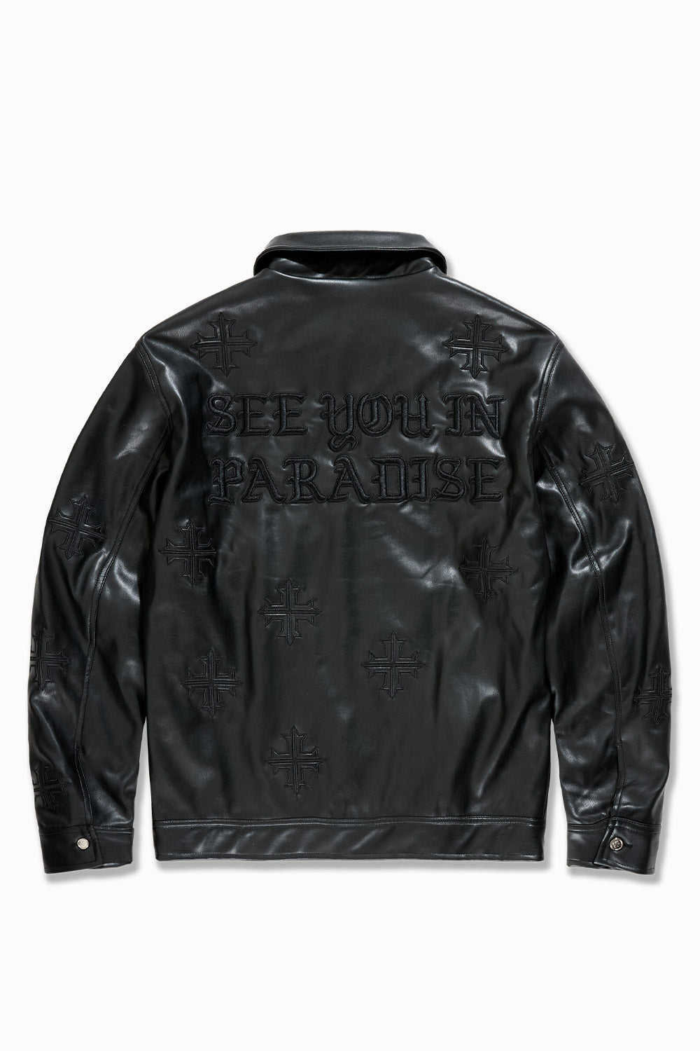 Designed to be the highlight of our debut drop, the Inferno Trucker Jacket brings premium edge to the classic trucker silhouette. Crafted in ultra-soft vegan leather with tonal embroidery throughout, it’s built to catch eyes without going over the top. The full-zip front and tailored fit keep it clean and structured, while the subtle See You In Paradise hits make it clear where you stand. Pair it with the matching Skinny Stacked Inferno Pants for the full look that defines the collection. This isn’t just another jacket—it’s the piece you build the night around.