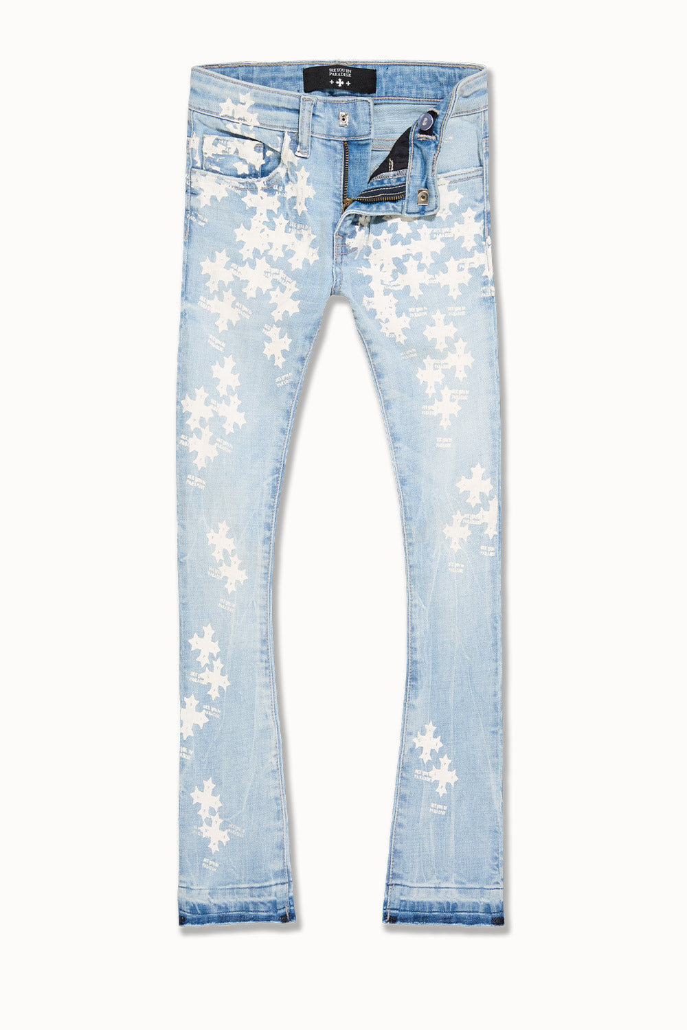 We took the same bold fit and premium details from our men’s Super Skinny Stacked Paradise Denim and scaled it down for the young ones ready to step into their own spotlight. Designed with a fitted leg and extra length to stack just right at the ankle, this denim gives kids that grown-up drip without compromising comfort. The stretch-infused fabric keeps things flexible for all-day movement—on the playground, at the party, or wherever they’re making noise. Offered in the same head-turning washes as the adult version, this denim is perfect for the mini-me moment—whether you’re stepping out side-by-side or just passing down good taste. Clean details, elevated design, and attitude to spare—this is Paradise made pint-sized.