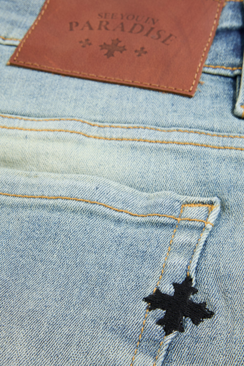 - Rip and repair design with raw denim backing