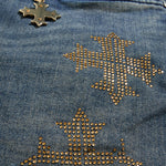 - Rip and repair design with raw denim backing