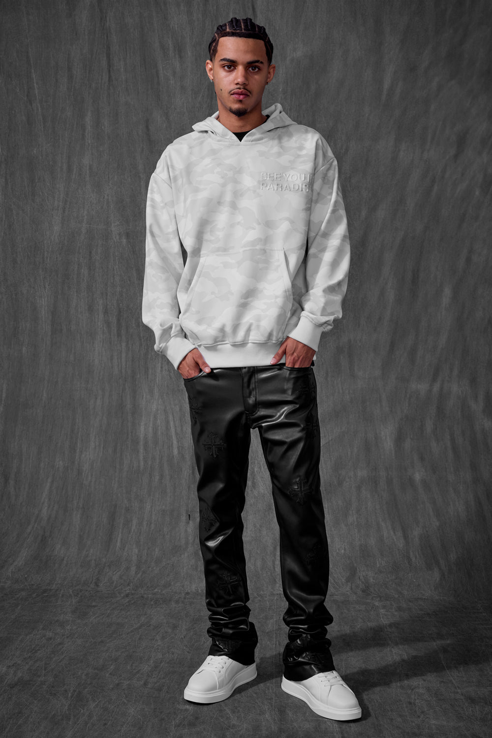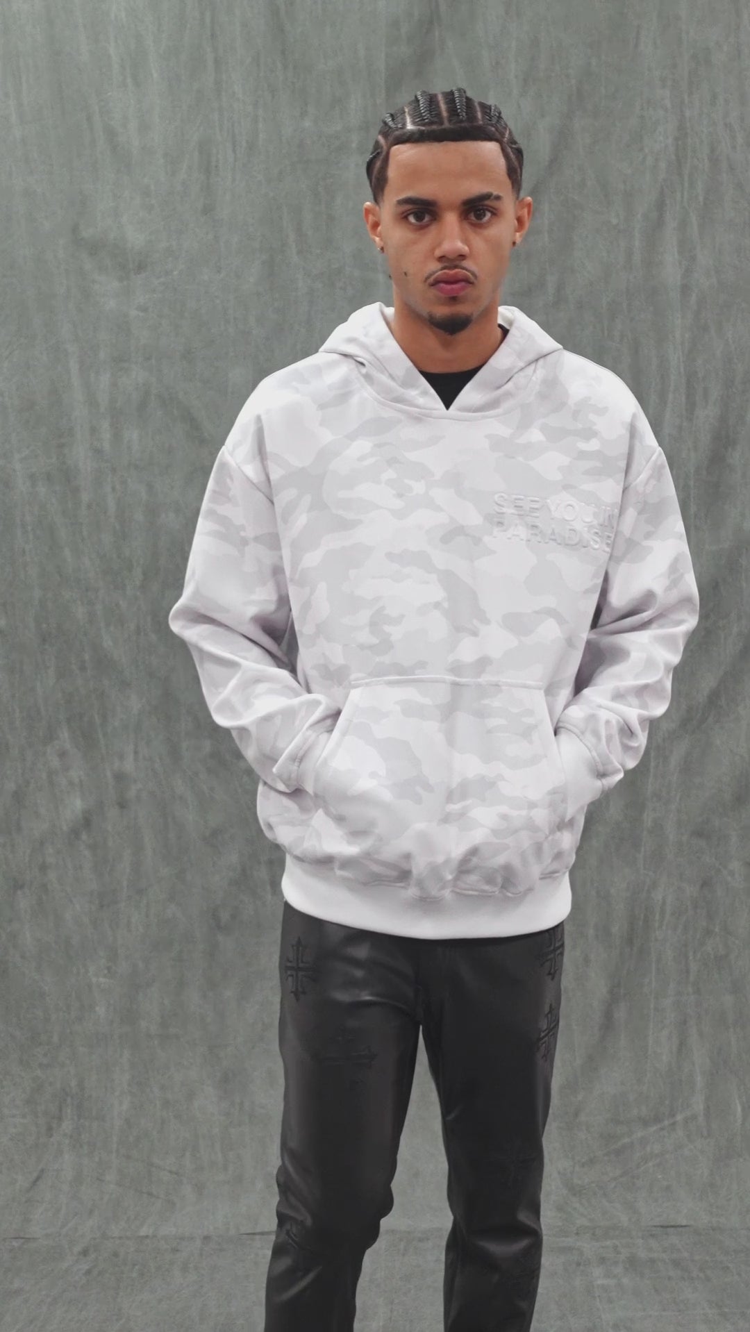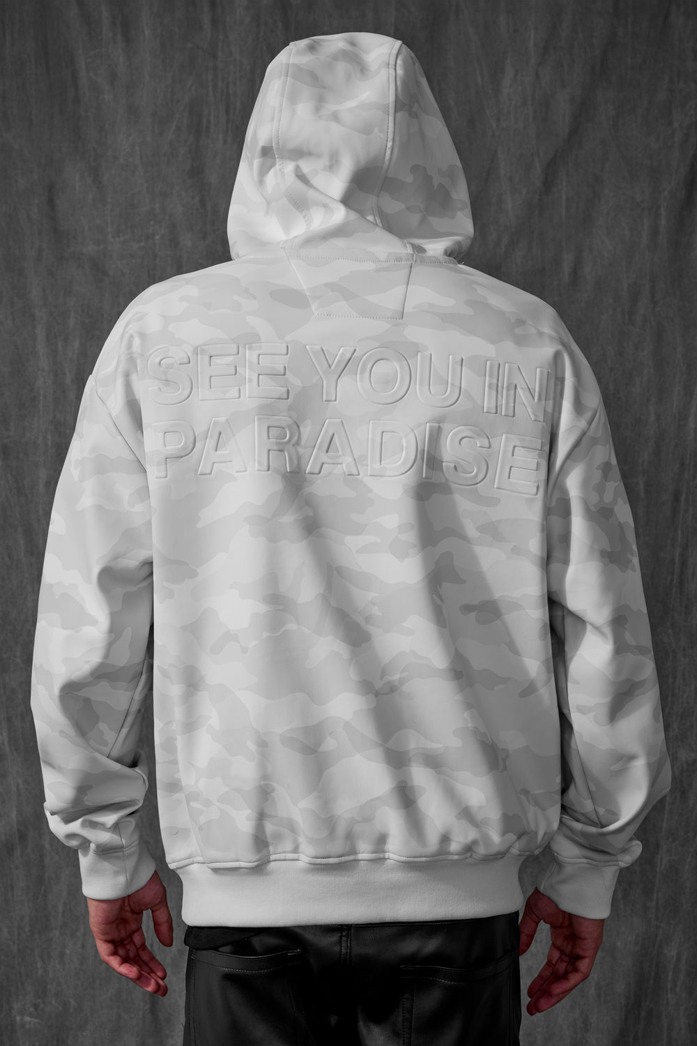 This one’s built to be seen. The Wild One Camo Pullover Hoodie takes the same sharp structure and embossed Paradise details as the original, but throws in a disruptive camo print that does all the talking. Available in Arctic and Vintage colorways, it’s designed to stand apart—whether you’re deep in the crowd or holding down your own corner of the room. The silhouette stays locked: ribbed trim, strong shoulders, and an oversized front pocket for whatever the night calls for. The tonal camo gives it that perfect balance—bold enough to catch looks, refined enough to wear on repeat. You want attention without asking for it? This is your uniform