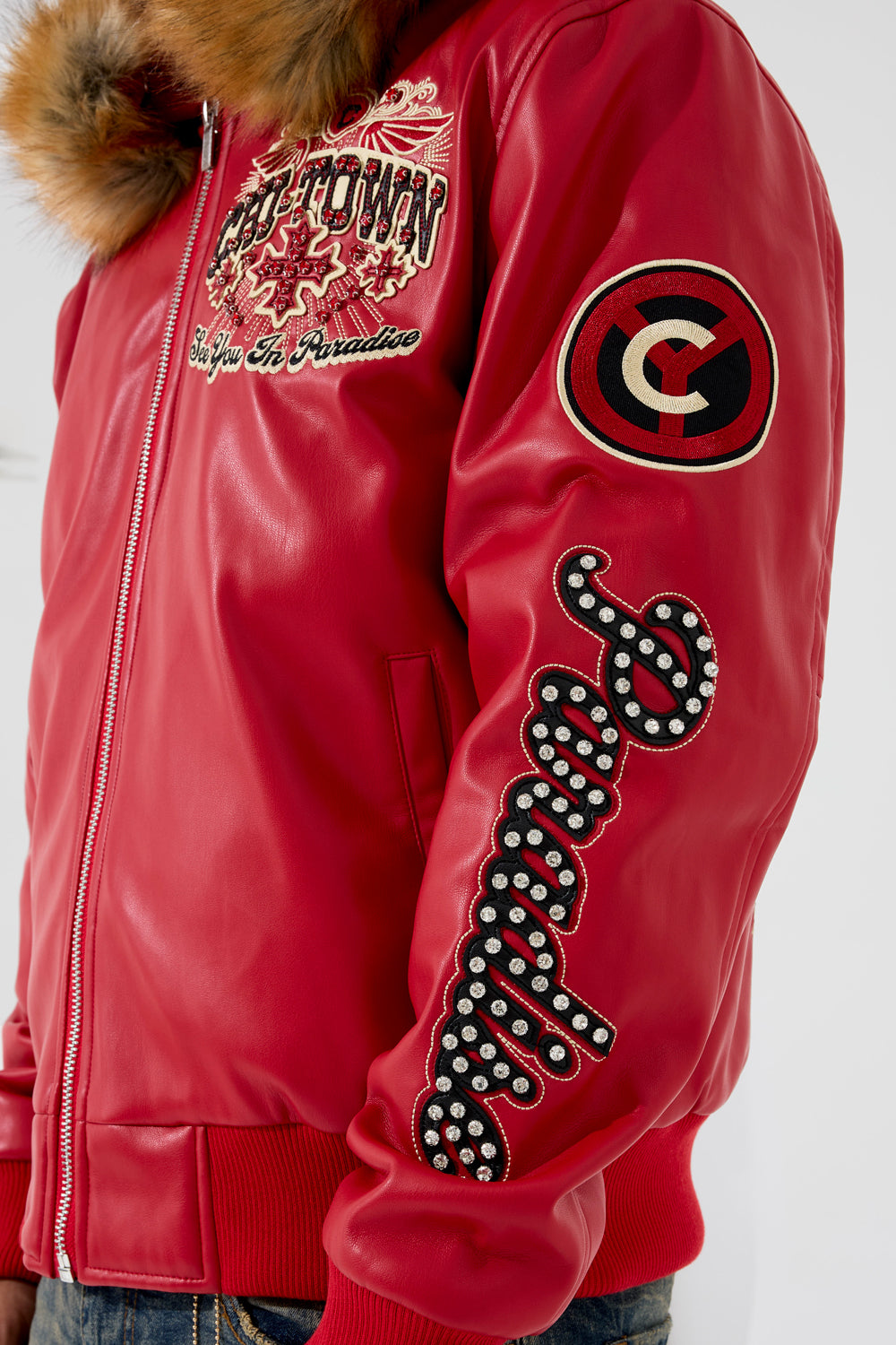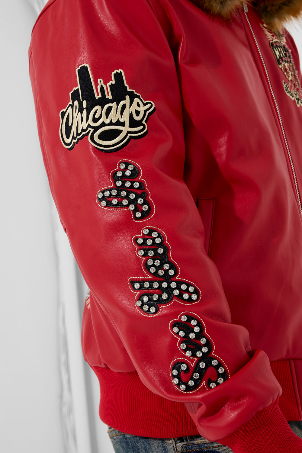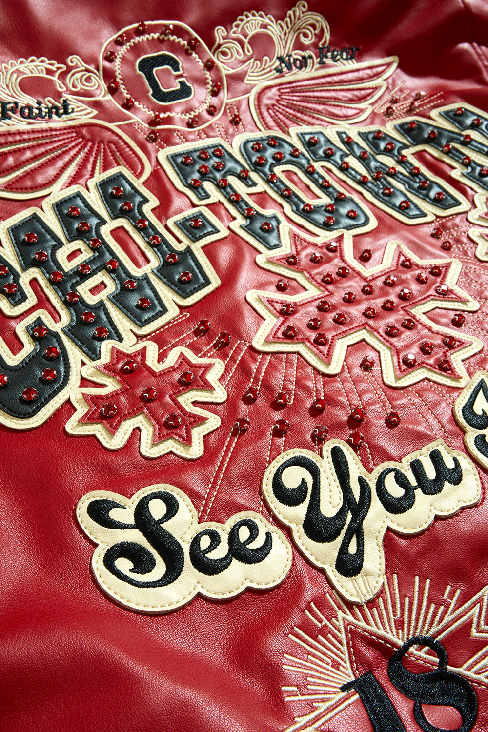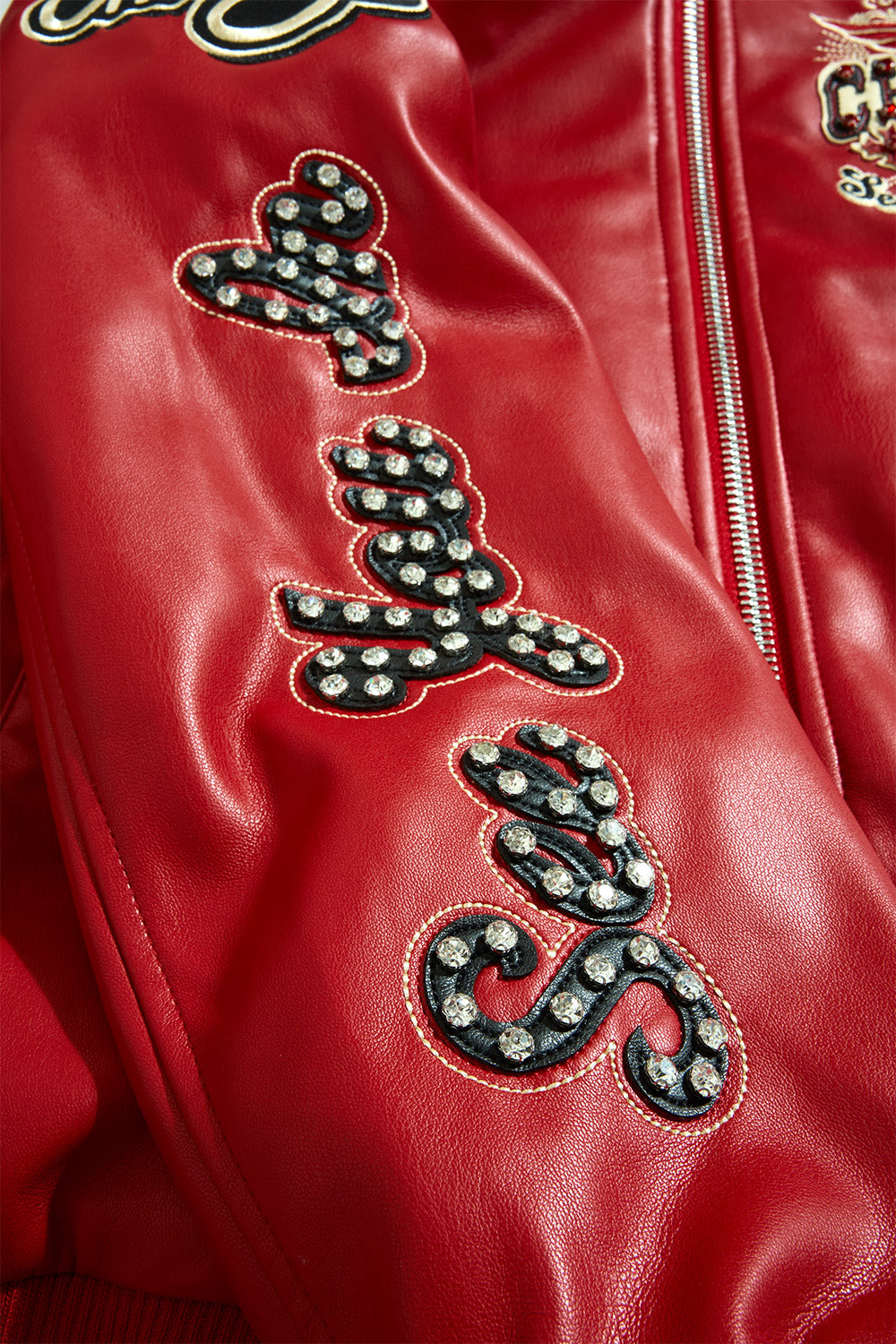 - Embellished with rhinestone, embroidery and Chenille patches through